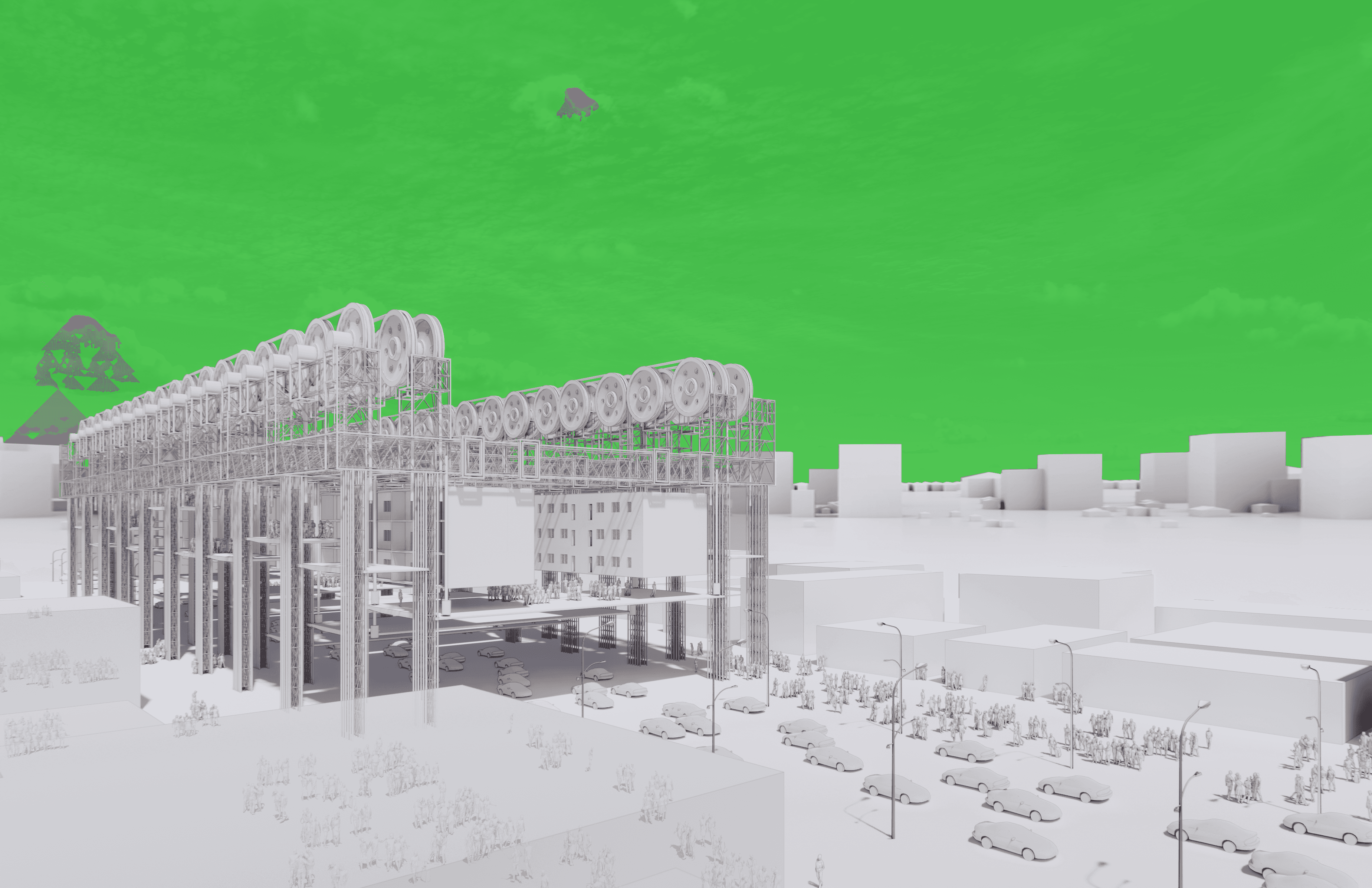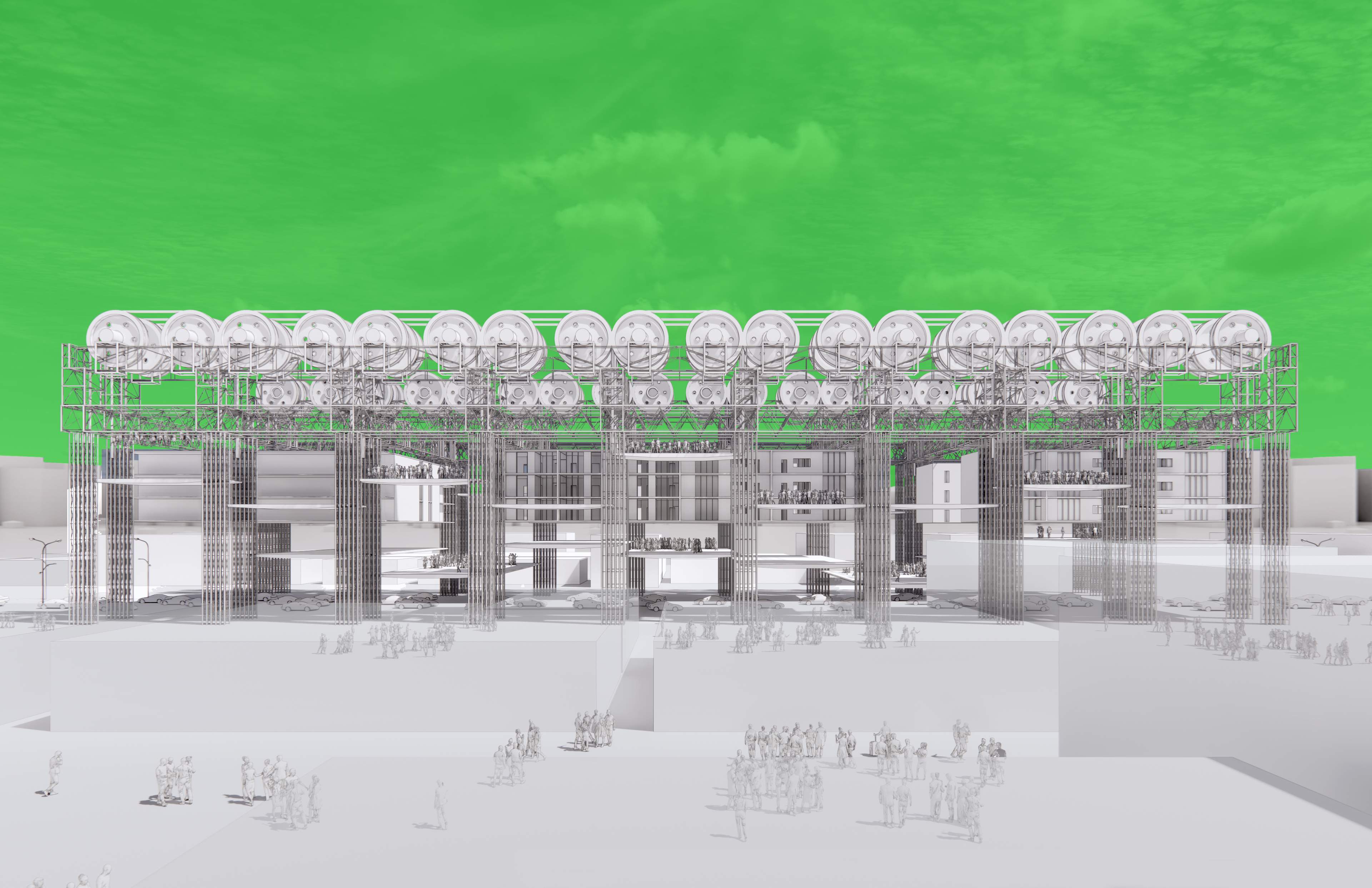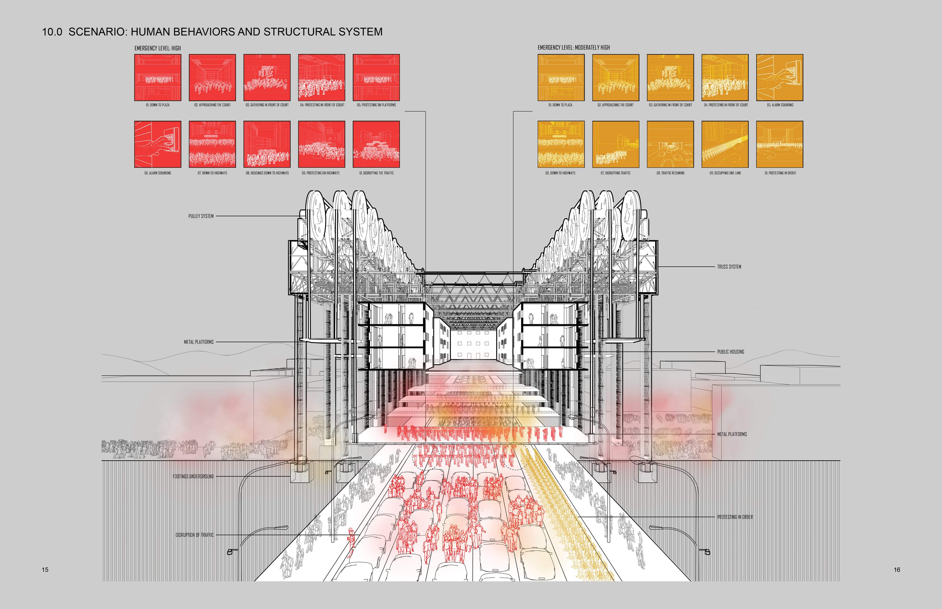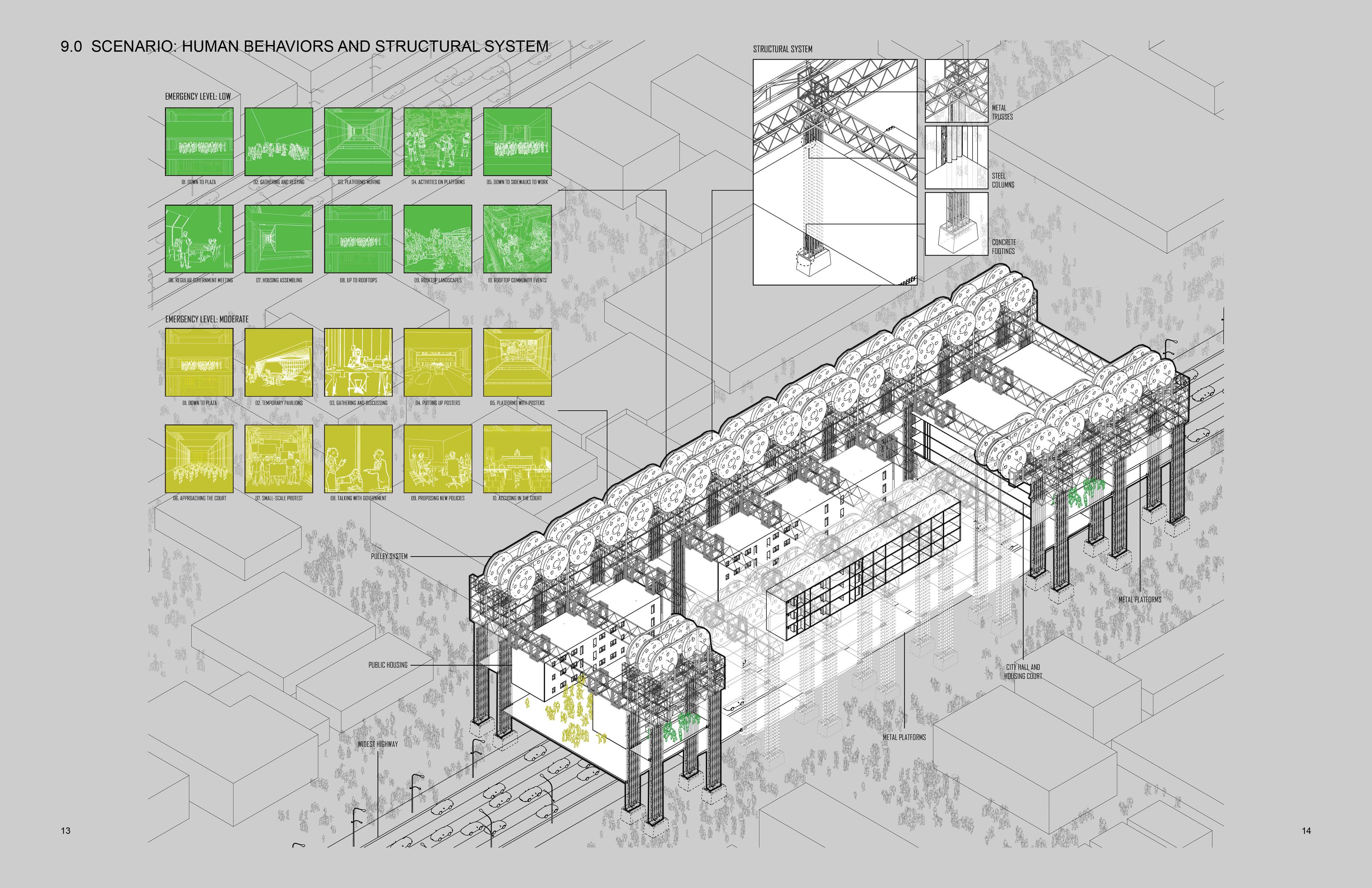 It is a social and political infrastructure that focuses on housing-right-protection and protest, offering both public housings which are these hanging boxes, and places for protests, like these hanging platforms.