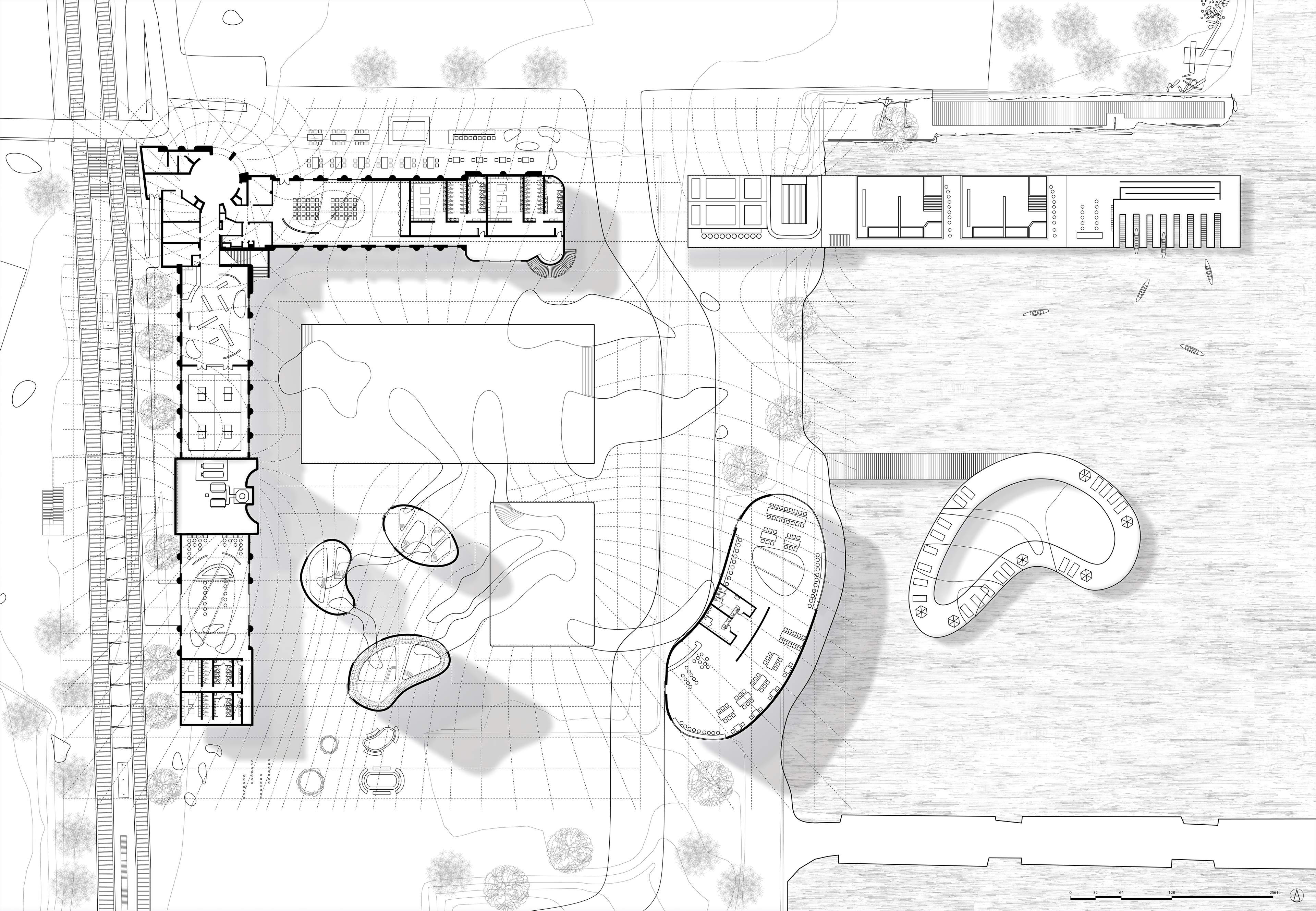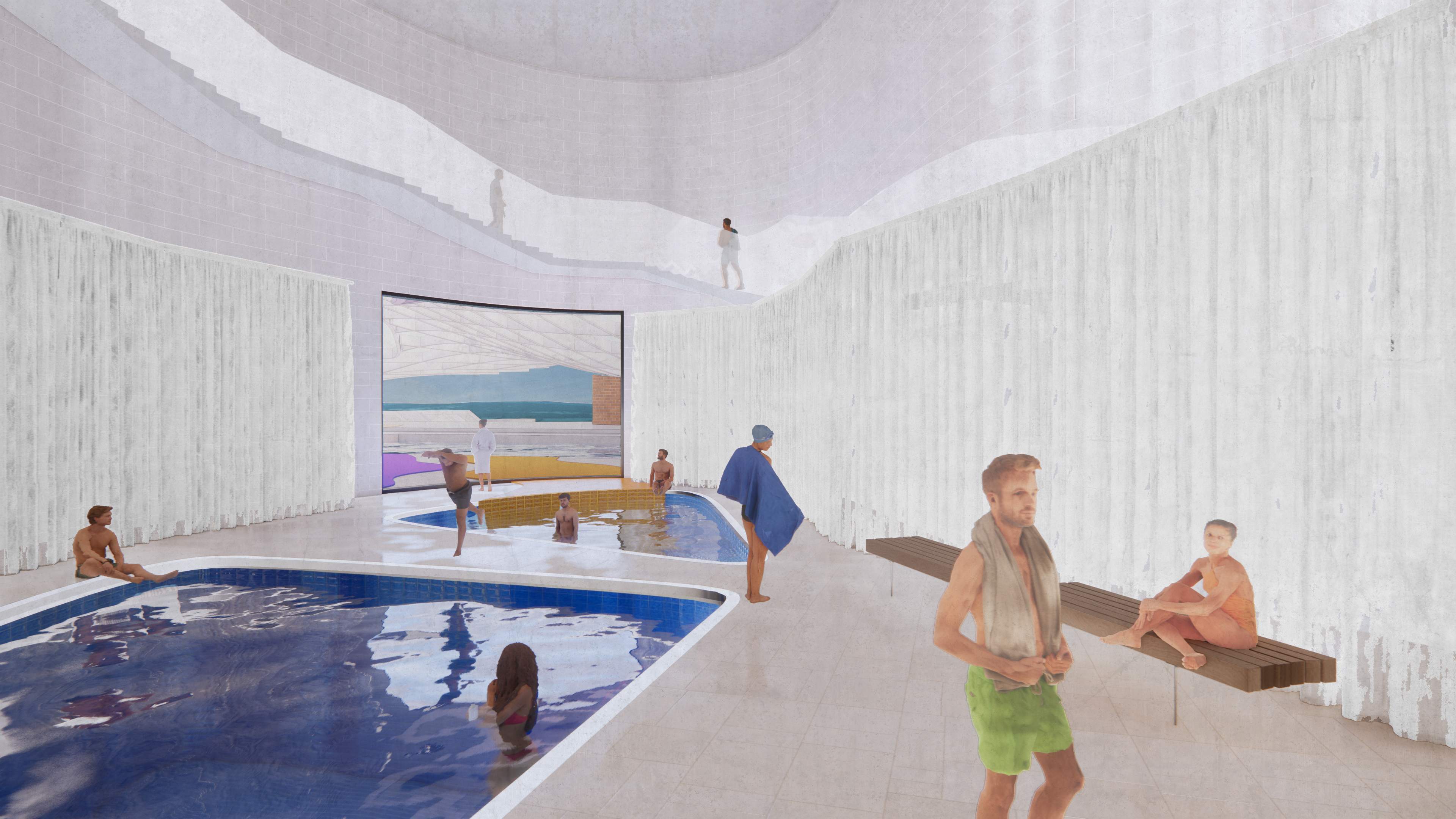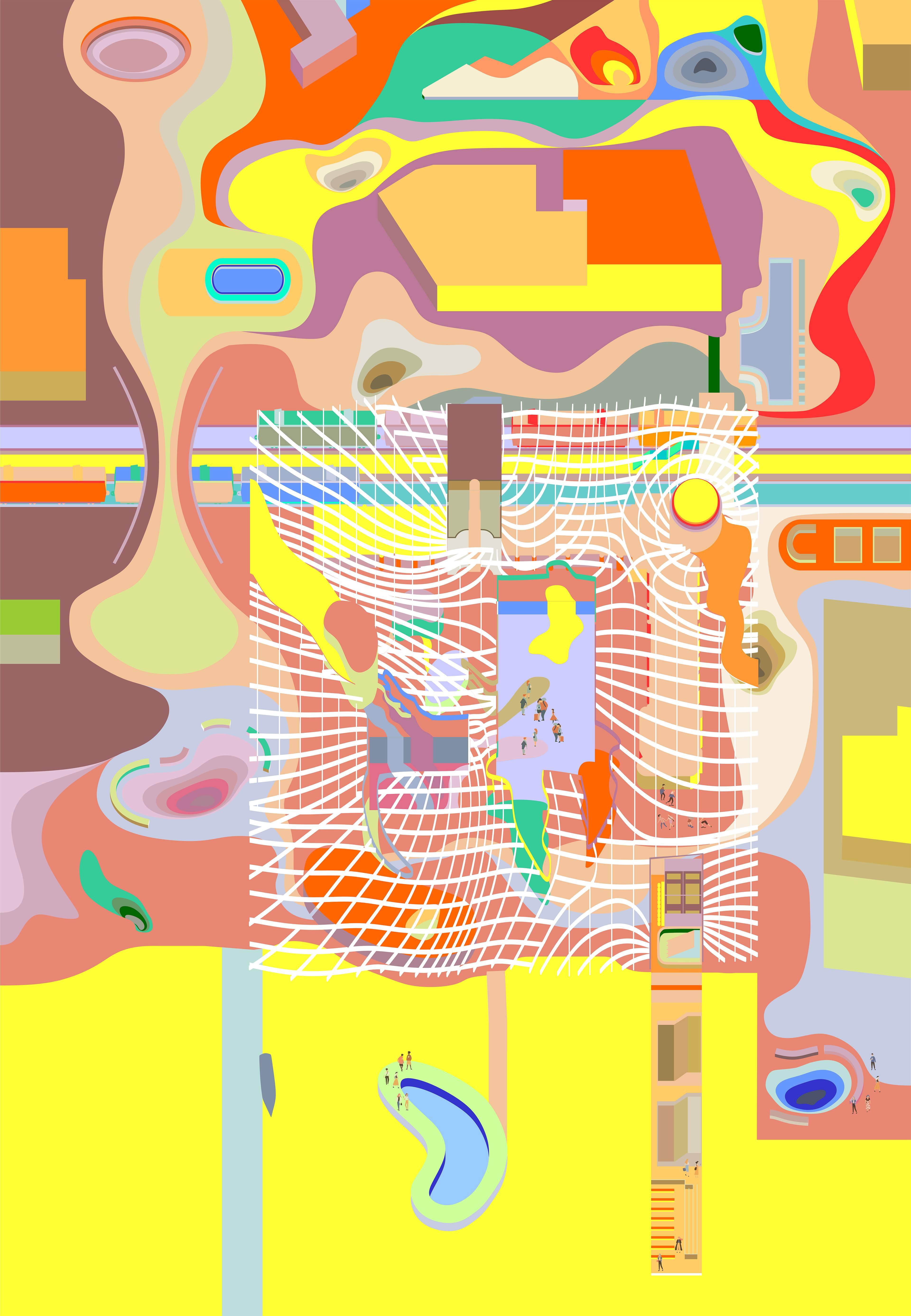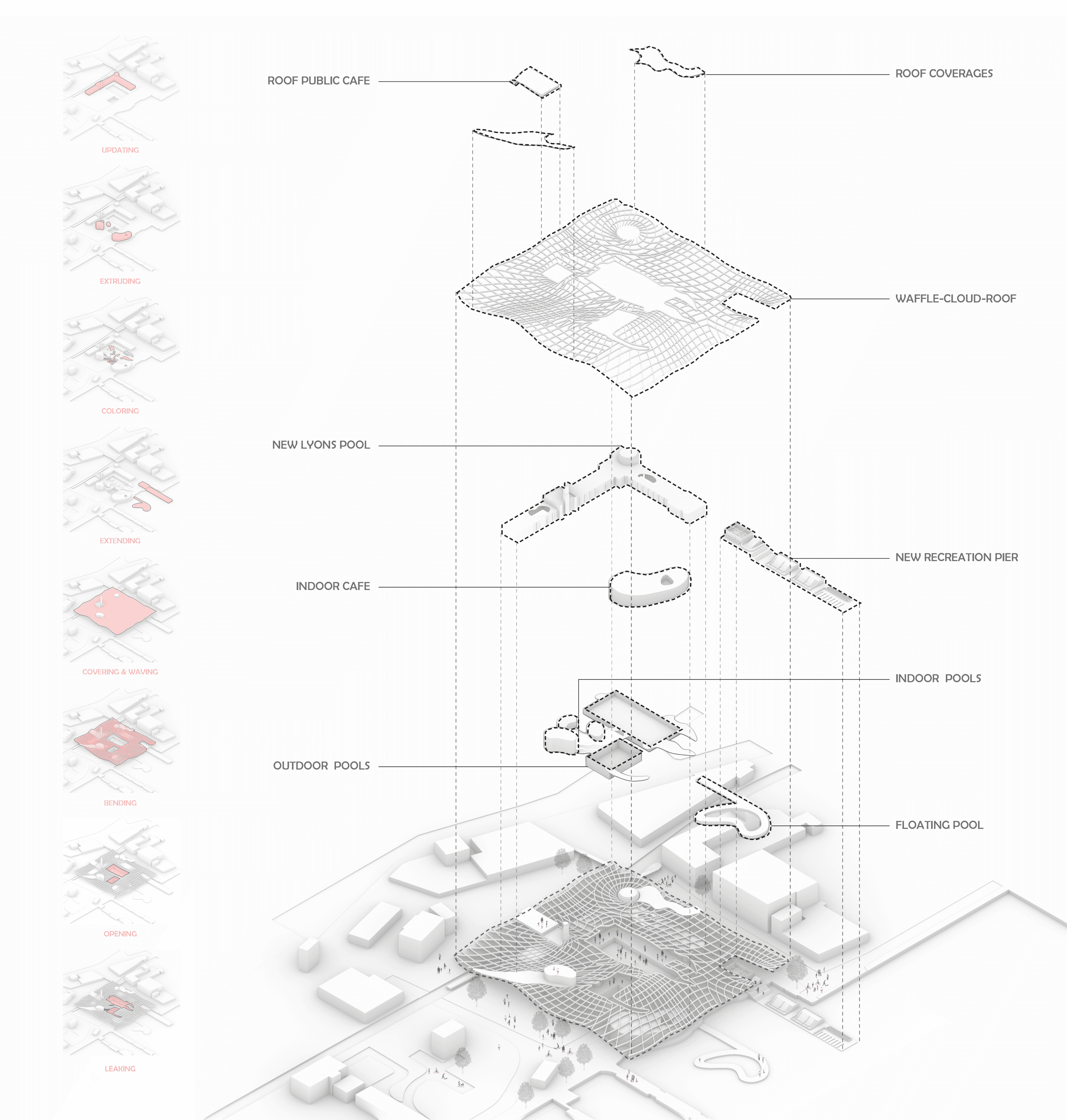 The design is inspired by the concept of a wound, symbolizing the city’s historical struggles, and integrates the existing Lyons Pool structures with innovative modifications. The centerpiece is the recreation of indoor and outdoor pools, featuring irregular shapes and blurred boundaries, echoing the artistic influence of Bodys Kingelez’s vibrant use of color.