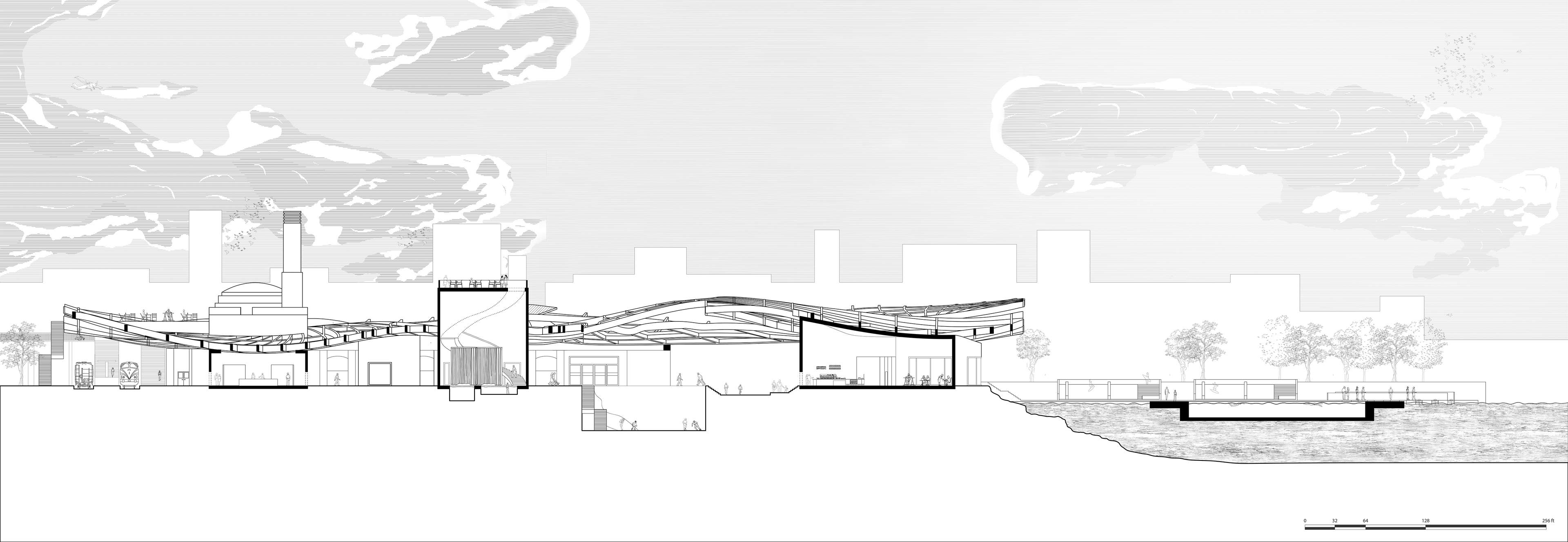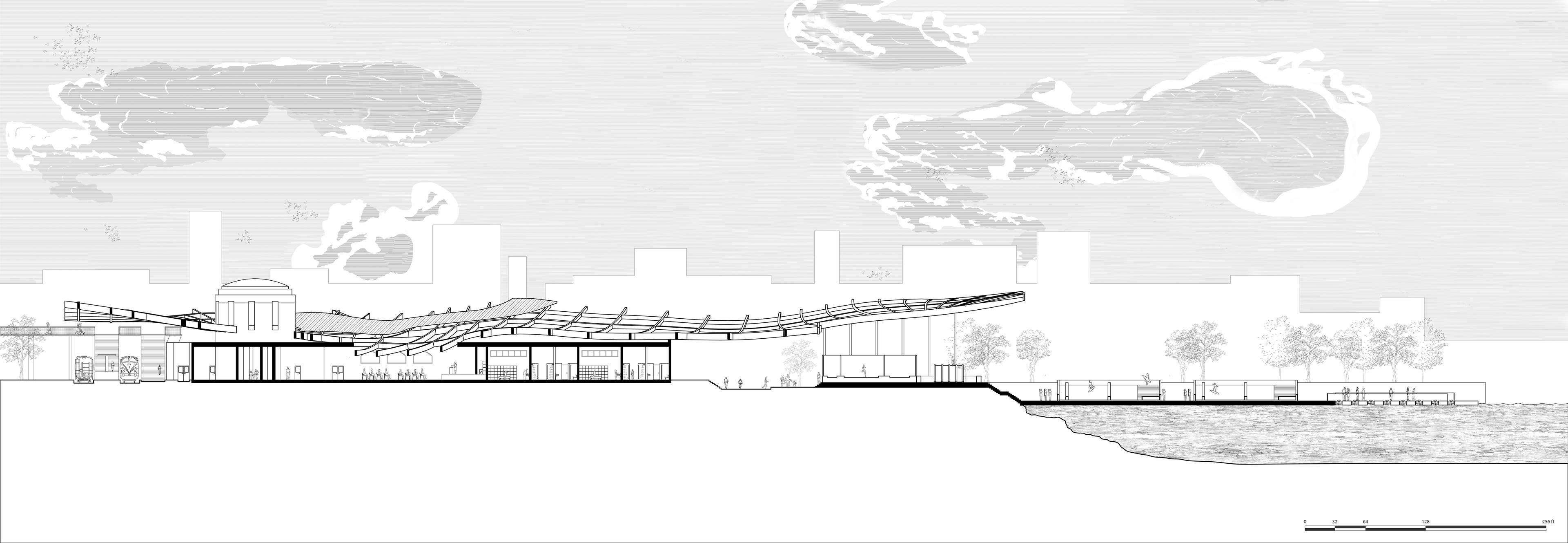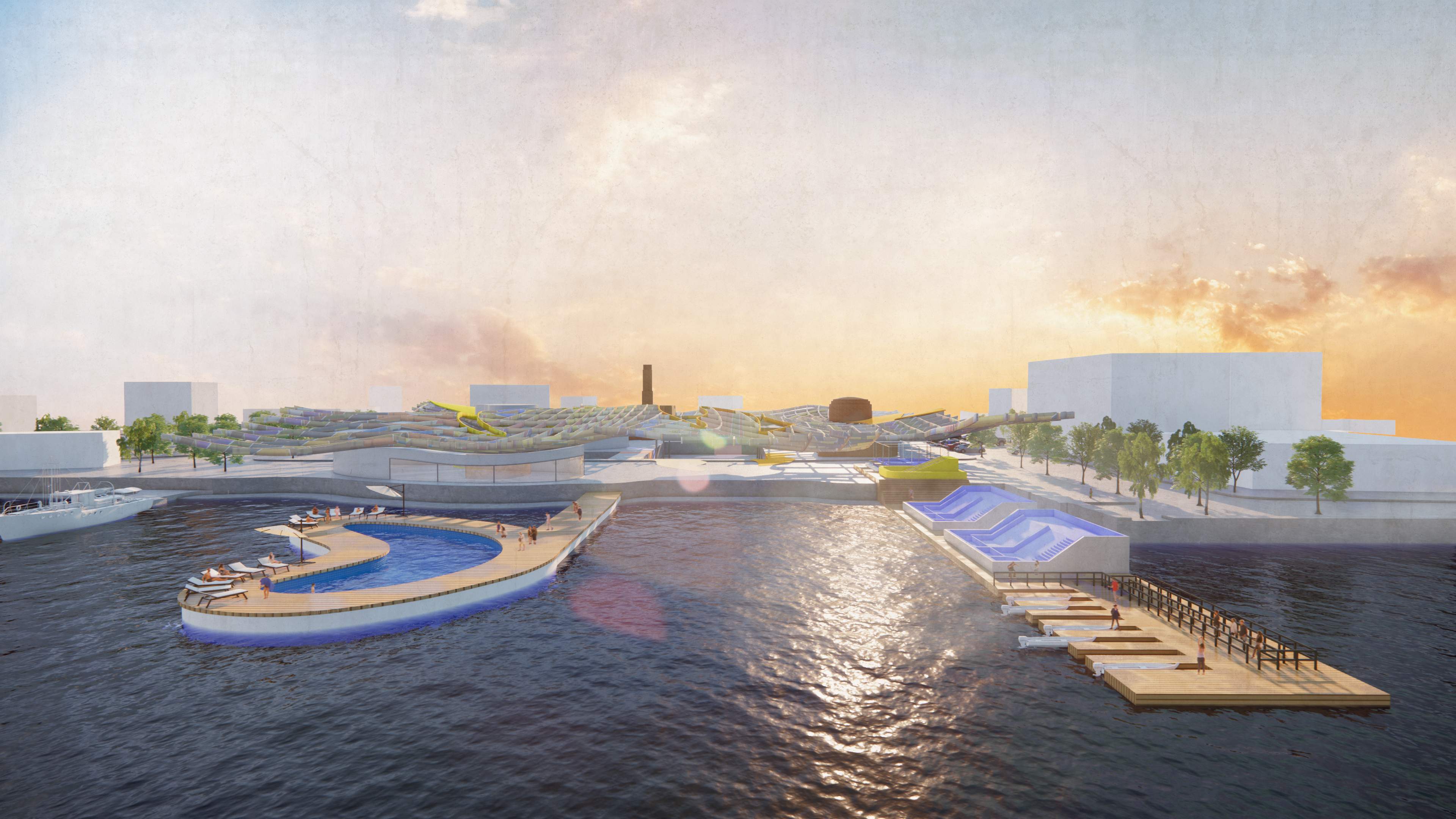 The new design features a unique roof structure with waffle patterns, creating shaded areas and open views while connecting the building volumes to the surrounding landscape. The project features a range of recreational facilities, including playgrounds, sports courts, and a boat launch. The roof’s interaction with the building creates diverse experiences, including natural light indoors and open views of the city and ocean. The design emphasizes seamless transitions between indoor and outdoor spaces, using color and materials to create an atmosphere of vitality and connection with nature.