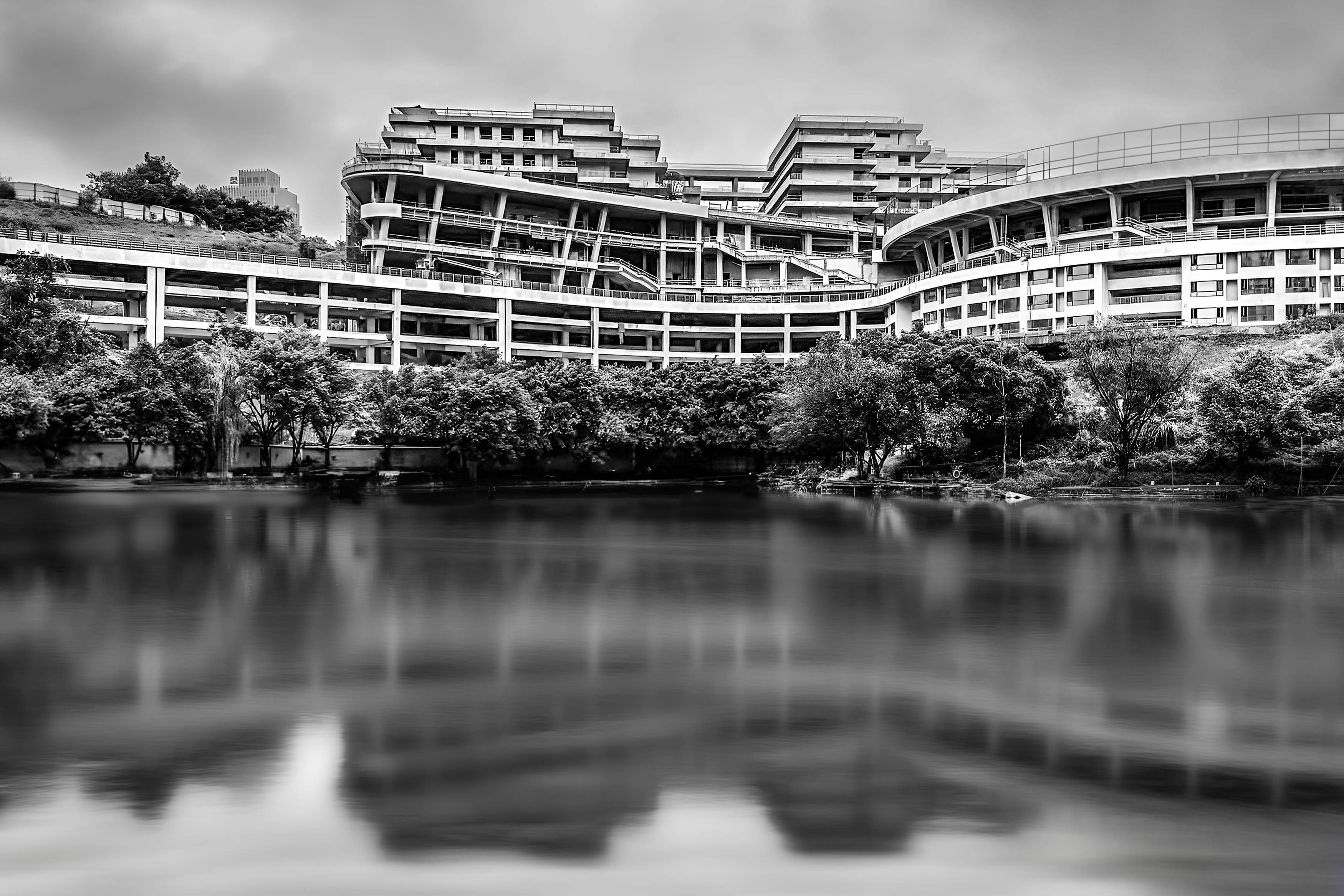 A layered façade meets its double across the water. Rhythm, weight, and line, anchored in concrete, drawn in reflection.