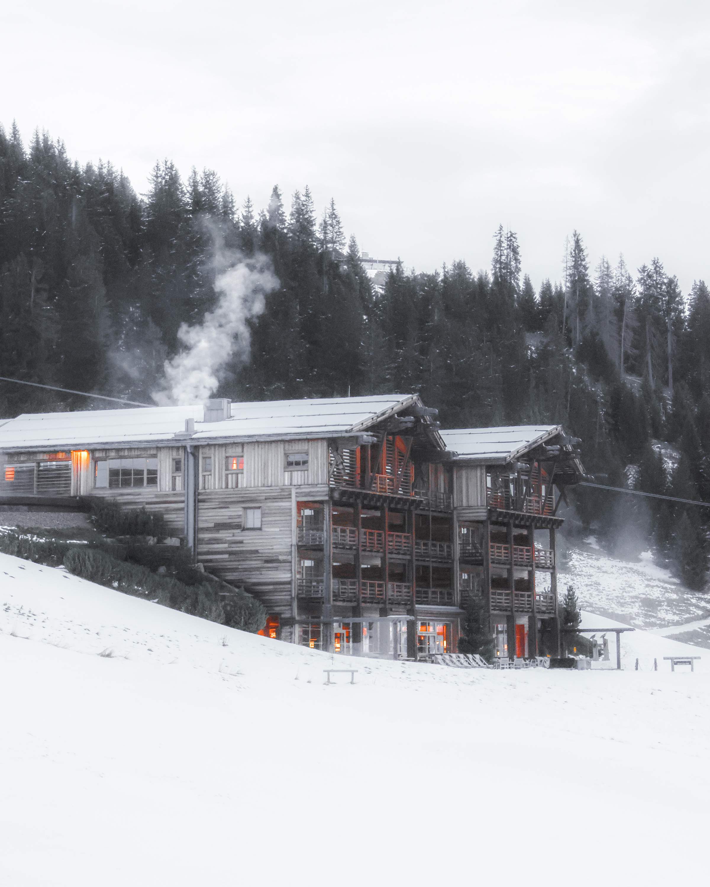 Nestled in the snowy folds of the Dolomites, these timber lodges stand at the intersection of architecture and alpine memory. With sharply pitched roofs, deep balconies, and rhythmic façades, they echo the vernacular logic of northern Italian mountain dwellings—structures built not only to withstand winter, but to belong to it. Smoke rises slowly against the forested backdrop, and warm interior light spills into the pale silence of snow. Winter Structures captures the dual nature of shelter in the high Alps: both functional and emotional, precise yet intimate. It is a portrait of place where architecture becomes part of the landscape’s rhythm—anchoring solitude, warmth, and the human scale in vast terrain.